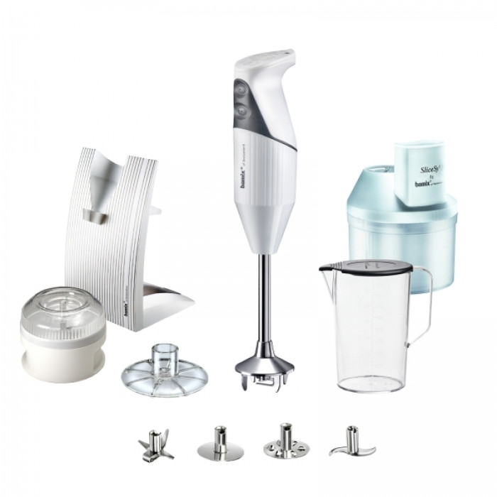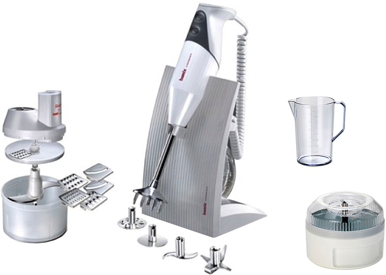 Блендер; Гарантийный талон; Инструкция; Держатель; Емкость 1000 мл; Терка с мелкими насечками; Терка с большими насечками; Насадка для взбивания; Многофункциональная насадка; Насадка для перемешивания; Насадка для рубки мяса; Терка со средними насечками; 2х Слайсер для тонкой нарезки
