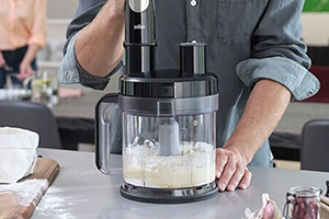 Представляет собой фактически самостоятельный прибор, работающий от мотора блендера. При подключении данной насадки погружной блендер временно приобретает качества стационарного. Это закрытая емкость объемом 2 л. (XL). Насадка-комбайн оснащена целым набором собственных насадок и инструментов: металлическим ножом для измельчения, крюком для замешивания теста, крупной и мелкой теркой-шинковкой, крупной и мелкой теркой, а также насадкой для жюльена и насадкой для нарезания ломтиков «картошки-фри».