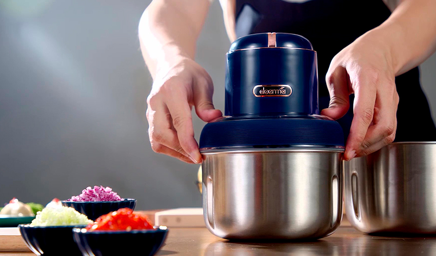 В комплекте с мясорубкой идут три чаши для разных функций – измельчения мяса и овощей, очистки чеснока от шелухи, смешивания консистенции. Чаши встраиваются в мясорубку, накладываясь одна на одну, как матрешка, для удобства хранения. Высота лезвия автоматически регулируется с помощью интеллектуального выдвижного узла двигателя в соответствии с объемом чаши.