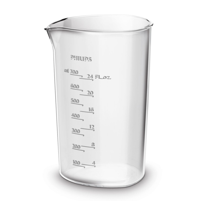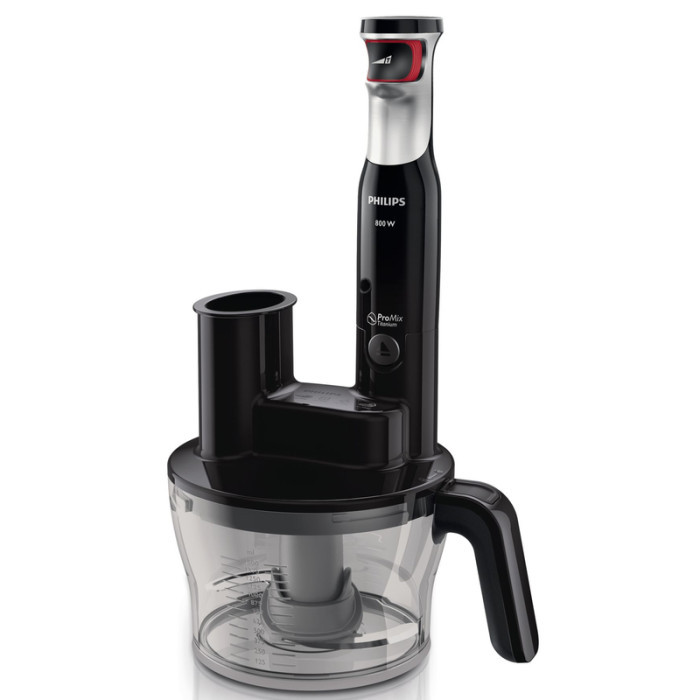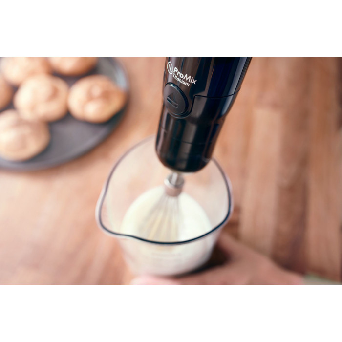 В комплект ручного блендера входит треугольный стакан емкостью 1 л. Стакан ручного блендера оснащен удобным носиком и мерной шкалой. Благодаря уникальной треугольной форме стакан удобно держать. Кроме того, внутри создается вихревой поток, благодаря чему ингредиенты находятся на дне стакана — у погружной насадки ProMix. Таким образом достигается оптимальный результат при смешивании, взбивании и измельчении.
