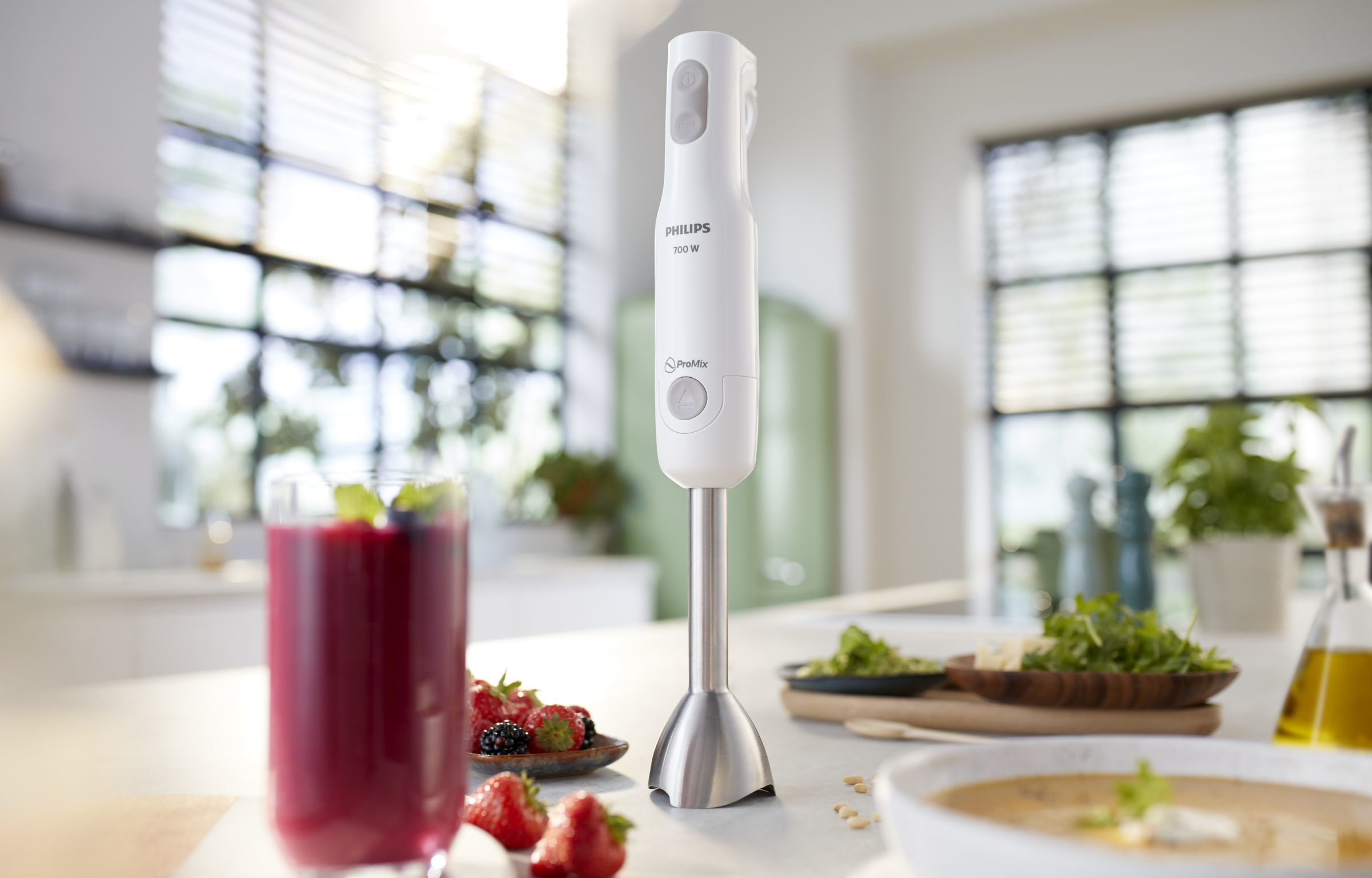 Специальная изогнутая форма нижней части ножки ручного блендера защищает от разбрызгивания и беспорядка во время смешивания.