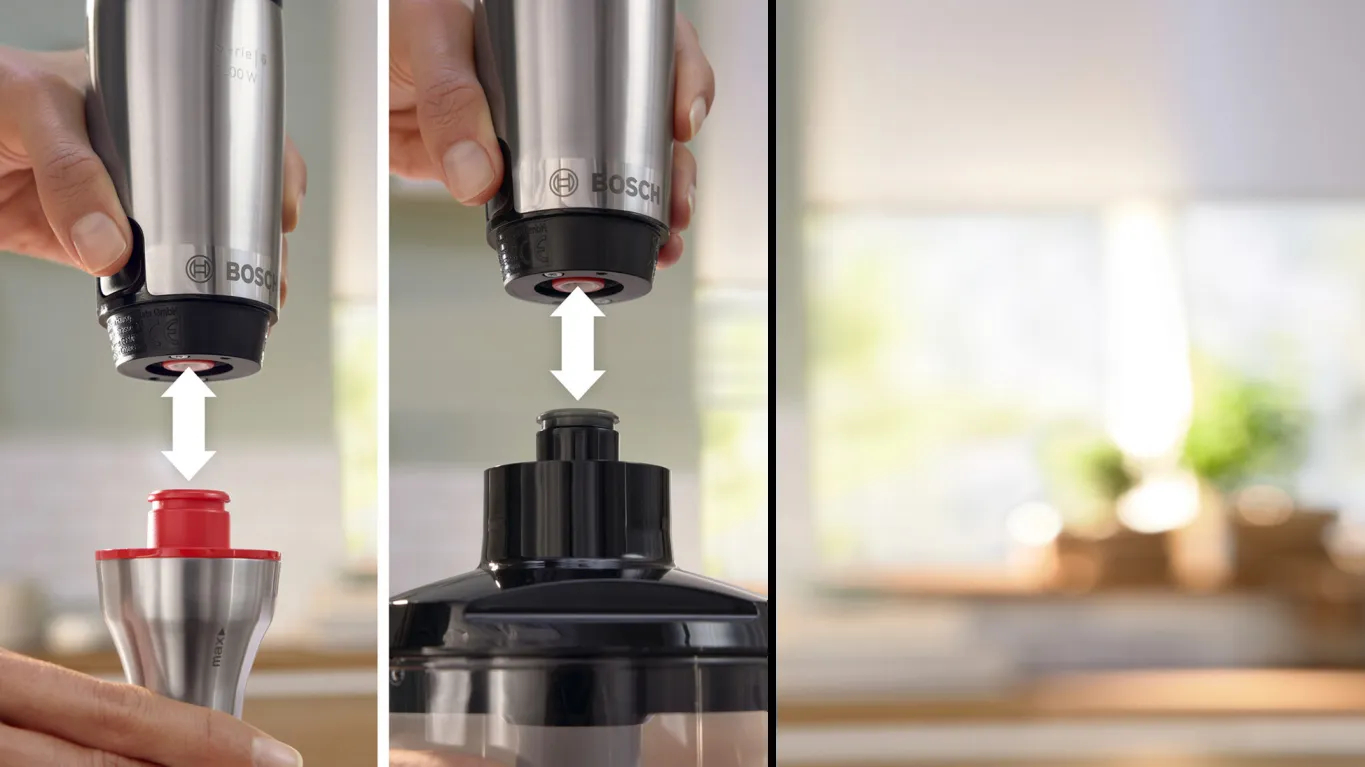 Зажмите кнопку с обеих сторон блендера и снимите ножку. Чтобы установить другой аксессуар, просто установите блендер до щелчка.