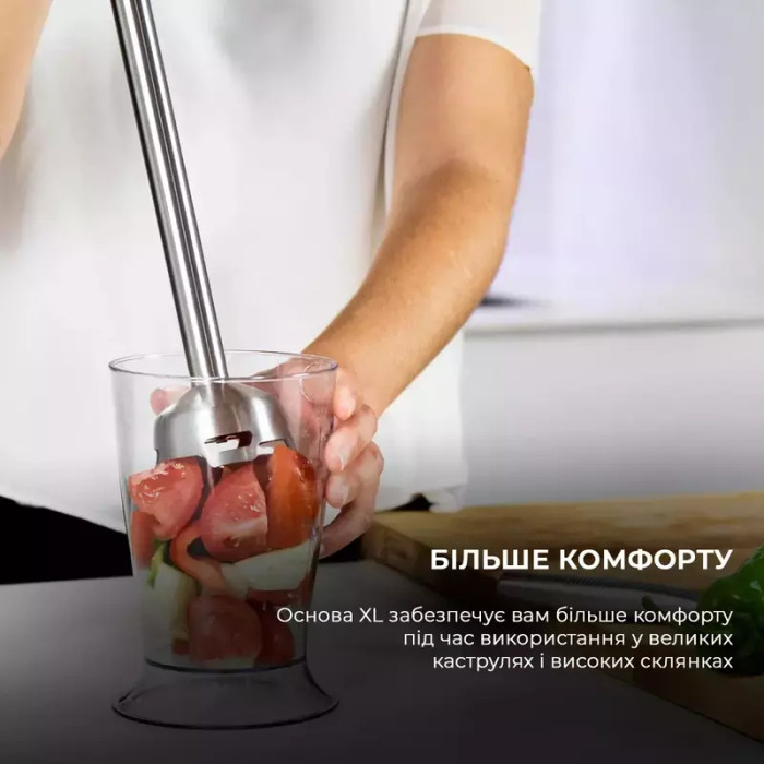Блендер имеет удлиненную ножку, чтобы вам было проще работать с продуктами в больших вместительных емкостях и чашах. Также такая длина защищает от чрезмерного разбрызгивания.