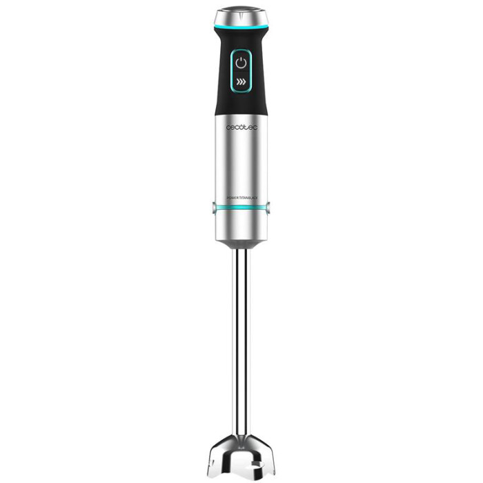 Погружной блендер CECOTEC Power TitanBlack 1200 XL PerfectCream&Crush выполнен из нержавеющей стали. На корпусе выделяется только ручка с черным антискользящим покрытием и несколько ярко-голубых акцентов.