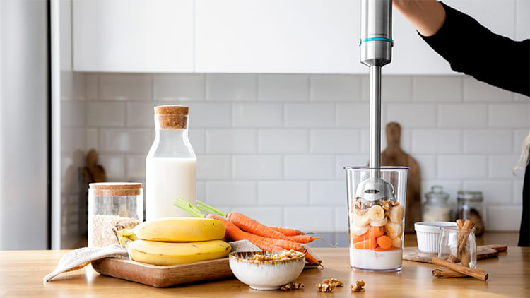 Меняйте режимы быстро и просто. Выбирайте медленный, средний или турбо-режим, в зависимости от вашего блюда. Кнопки питания и переключения скоростей находятся прямо на ручке блендера. А для особого комфорта используйте поворотное кольцо со светодиодным индикатором. Пока девайс работает, оно эффектно светится синим.