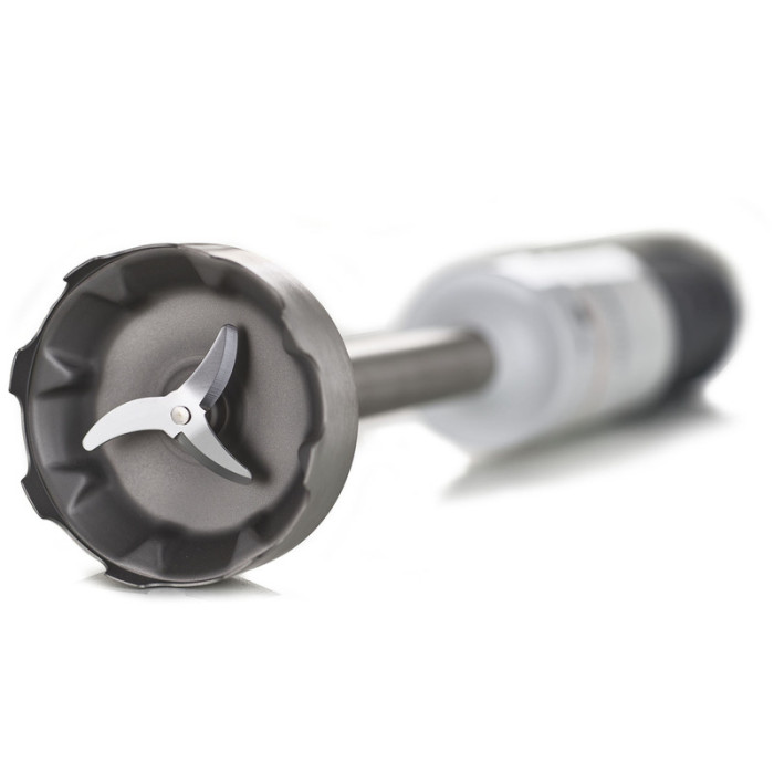 Потребляемая мощность не превышает 850 Вт. Доступен 1 скоростной режим. Но данный блендер также имеет опцию «Turbo», которая позволяет увеличить скорость вращения лезвий и получить еще более гладкий и однородный результат по нажатию соответствующей кнопки. Благодаря продуманному эргономичному дизайну рукоятки, прибор отлично лежит в руке, не выскальзывая даже из влажной ладони.