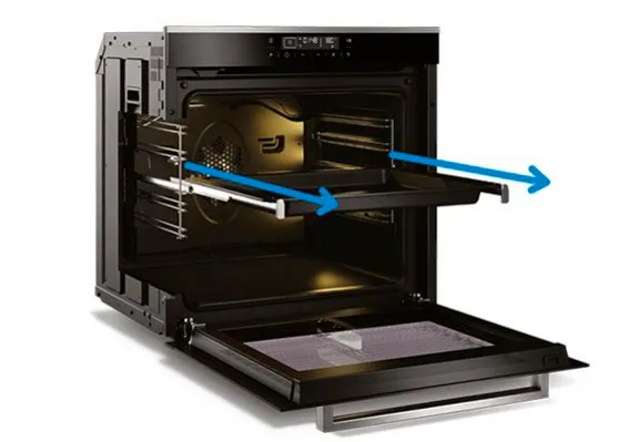 Безопасное и удобное извлечение противня. Если вам трудно доставать из духовки тяжелые блюда, телескопические направляющие упростят вашу жизнь. Система направляющих позволяет полностью (или на 2/3 для моделей с частичными телескопическими направляющими) выдвинуть противень из духовки и обеспечивает его поддержку.