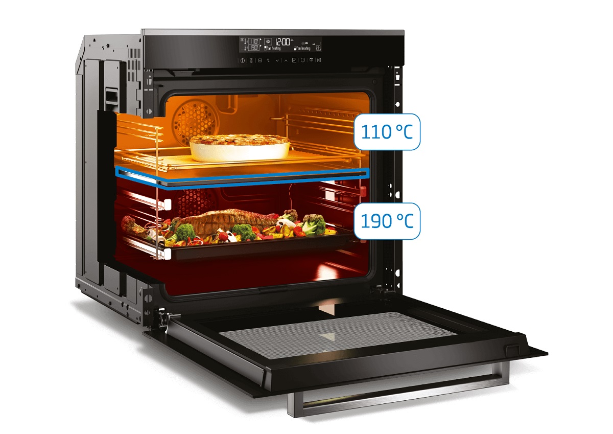 Используйте духовой шкаф максимально эффективно. Теперь можно готовить два блюда одновременно, не тратя время и электричество. Технология Split&Cook® позволяет разделить духовой шкаф на две части, у каждой из которых будет индивидуальный вентилятор, таймер и терморегулятор, благодаря чему можно готовить два блюда без смешивания их запахов. Это как два духовых шкафа в одном.