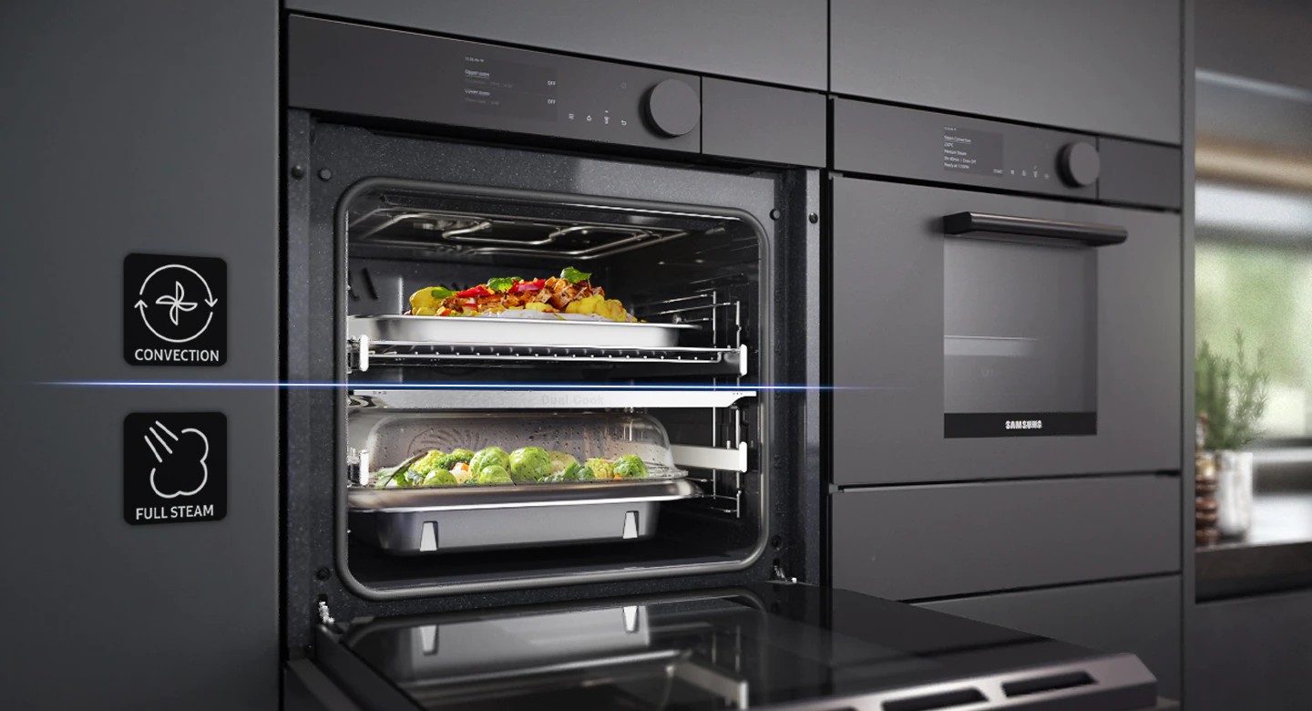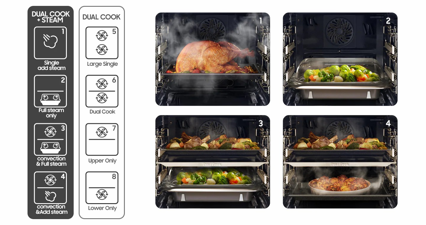 Наслаждайтесь гораздо большей свободой действий при совместном приготовлении различных блюд. Dual Cook Steam имеет верхнюю и нижнюю зоны, которые работают независимо друг от друга, поэтому вы можете готовить различные блюда с разными настройками температуры и времени или использовать весь духовой шкаф для приготовления больших блюд.