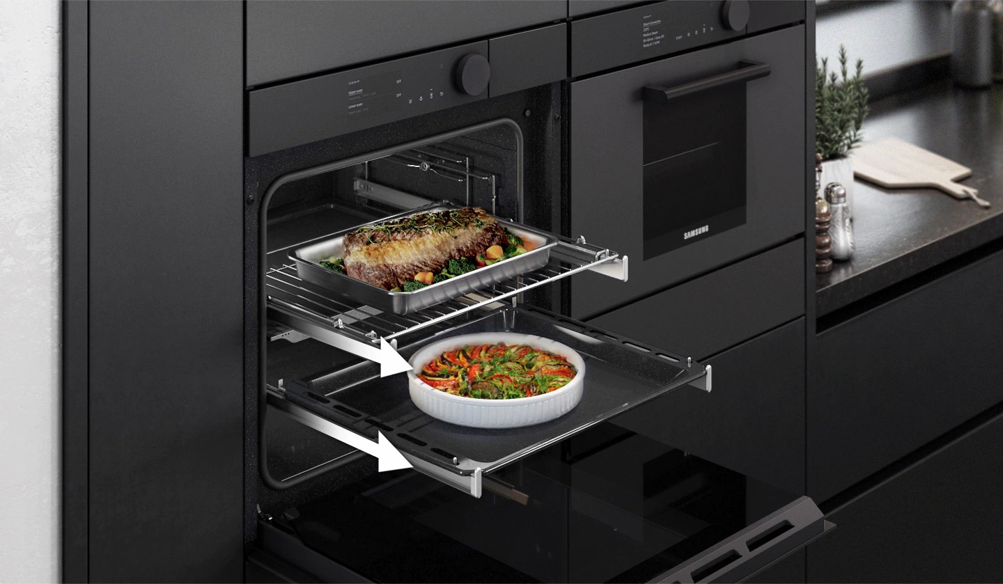 Ставить в духовку и доставать из нее блюда стало намного легче. 2 телескопические направляющие на верхнем и нижнем уровнях скользят плавно и почти без усилий, даже с тяжелыми сковородами. Они выдвигаются полностью с гораздо меньшим трением, поэтому их легче загружать и выгружать. Вы можете готовить и переворачивать блюда, не проливая их.