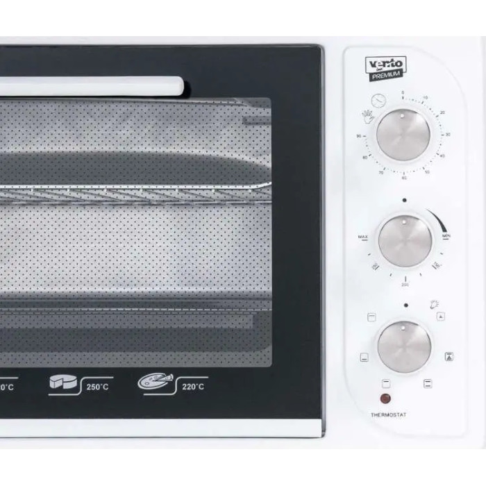 Автовыключение; Уплотнитель стеклянной дверцы; нагревательные элементы из нержавеющей стали; механизм легкого съема дверцы; индикатор работы; индикатор термостата; плотное крепление нагревательных элементов; защитное крепление из металла для стекла; Таймер 90 минут