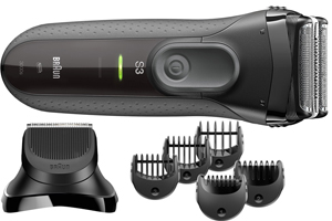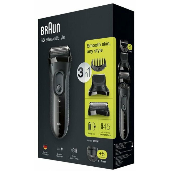 Электробритва Braun Series 3 3000BT – мультифункциональное устройство, которое объединяет в себе возможности сразу трёх приборов: бритвы, триммера и стайлера. С помощью бритвенной головки вы с легкостью избавитесь от надоевшей щетины, а насадка-триммер и 5 гребней (на 1, 2, 3, 5 и 7 мм) помогут вам в идеальном уходе за вашей бородой.