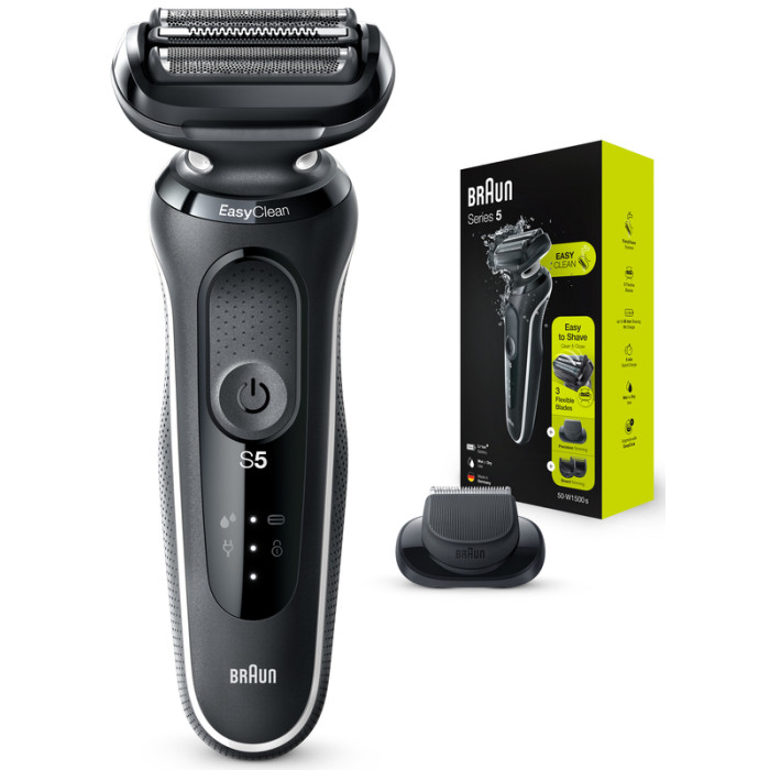 Braun Series 5 51-W1500s - гладкое бритье стало проще: 3 гибких лезвия этой электробритвы плавно повторяют контуры вашего лица, а система EasyClean позволяет быстро и легко чистить, не снимая бритвенную головку. Эффективен даже при жесткой щетине: технология AutoSense анализирует щетину и регулирует мощность в зависимости от ее густоты, захватывая и подравнивая больше волос при каждом бритье. В комплект входит насадка для триммера 0,5–7 мм.