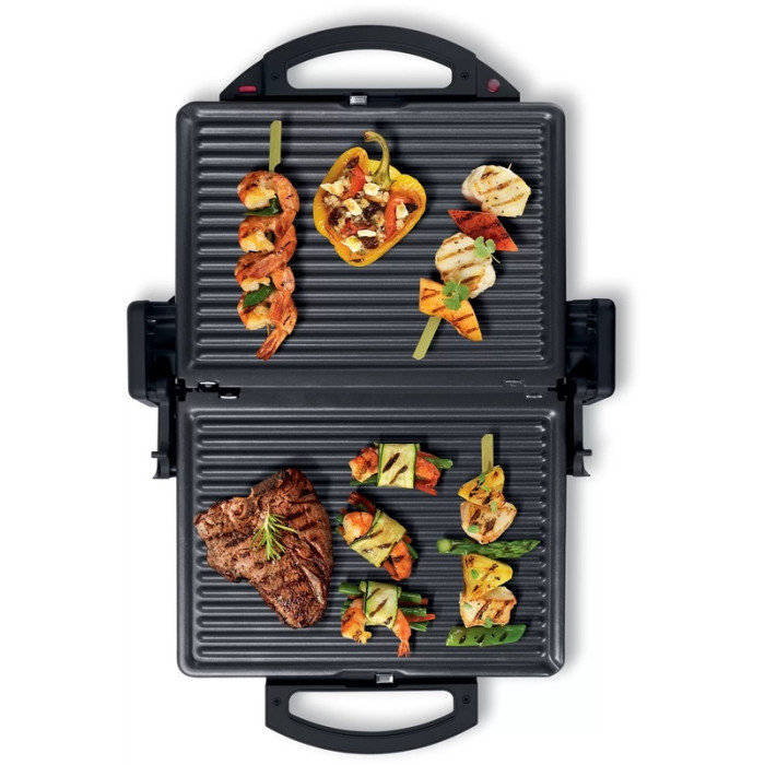 - Гриль 3-в-1: закрытый как контактный гриль, открытый как настольный гриль или с верхним и нижним жаром для запекания как в духовом шкафу.