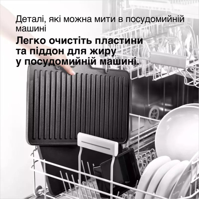 Благодаря съемным антипригарным пластинам и поддону для жира чистить гриль удобно и легко. Несмотря на то, что они снабжены высокоэффективными встроенными нагревательными элементами, пластины для гриля можно мыть в посудомоечной машине.