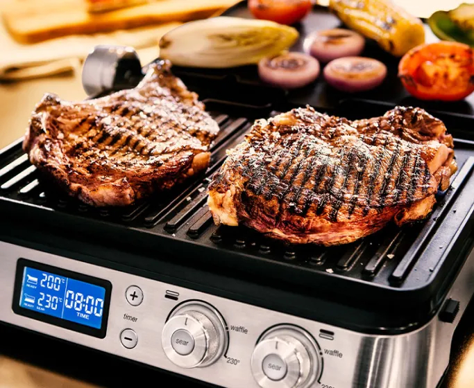 Необычайная точность и отличная универсальность у вас под рукой. Два независимых электронных регуляятора температуры позволяют точно установить температуру каждой пластины по отдельности, чтобы вы могли одновременно готовить два разных блюда на двух разных температурах.