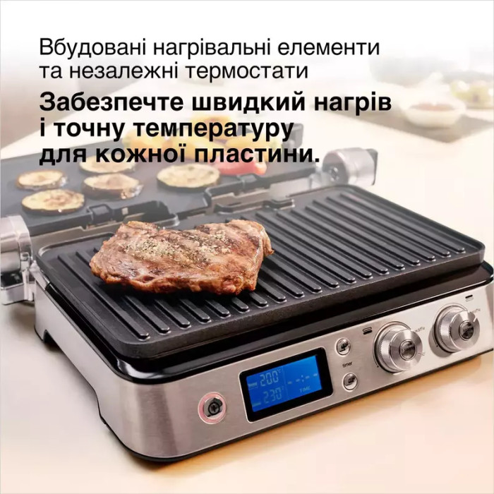 Необычайная точность и отличная универсальность у вас под рукой. Два независимых электронных регулятора позволяют точно устанавливвать температуру каждой пластины по отдельности, чтобы вы могли одновременно готовить два вида блюд при двух температурах.