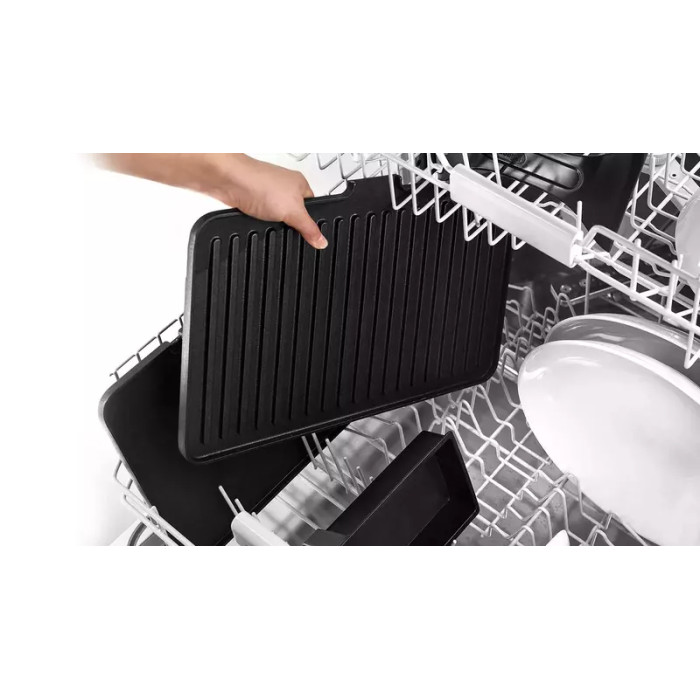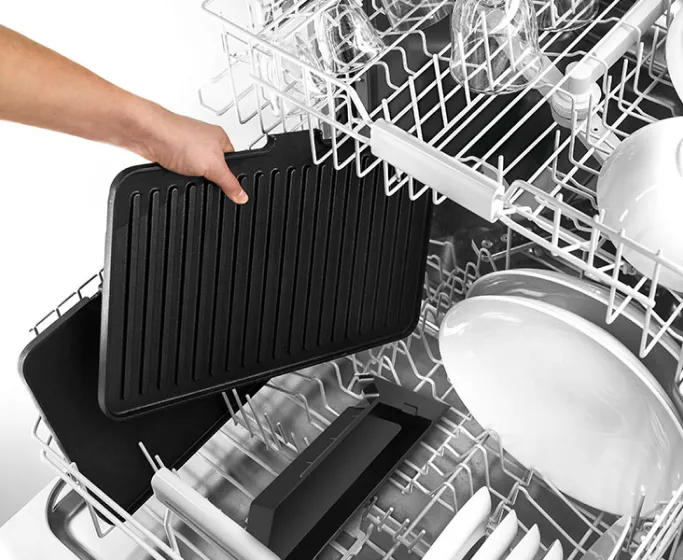 Благодаря съемным антипригарным пластинам и поддону для жира чистить гриль удобно и легко. Несмотря на то, что пластины оснащены высокоэффективными встроенными нагревательными элементами, их можно мыть в посудомоечной машине.