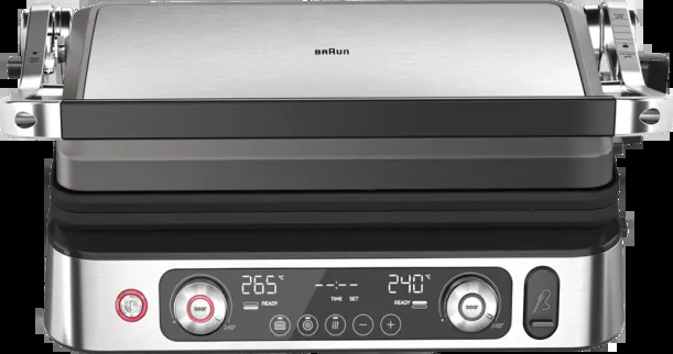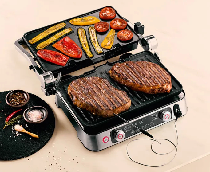 Необычайная точность и универсальность у вас под рукой. Два независимых электронных регулятора температуры позволяют точно установить температуру каждой пластины по отдельности, чтобы вы могли одновременно готовить два вида пищи на двух разных температурах.