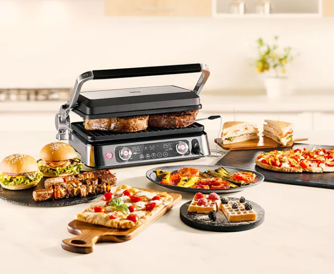 От стейков, рыбы, овощей до кесадильи, панини, блинов, яиц или вафель – этот гриль может все. Три комплекта пластин с антипригарным покрытием – гриль, плоские и вафельные – позволяют готовить любое блюдо в зависимости от ваших кулинарных предпочтений.