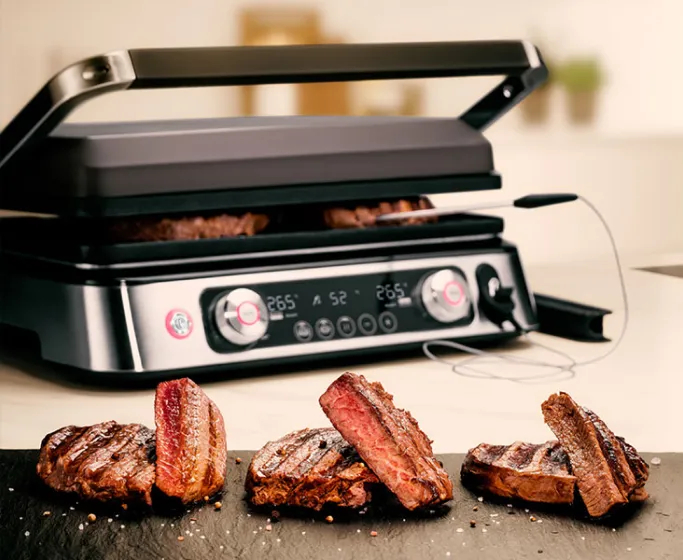 Ваш любимый стейк, приготовленный именно так, как вы любите. Благодаря одноступенчатой точности термощупа все, что нужно сделать для получения профессиональных результатов, это вставить датчик в центр мяса и подключить его к MultiGrill. Нажмите кнопку Sear, чтобы увеличить мощность, разогрев гриль до 265°C на несколько минут. Насыщенная румяная корочка подчеркнет пикантный вкус вашего любимого стейка.