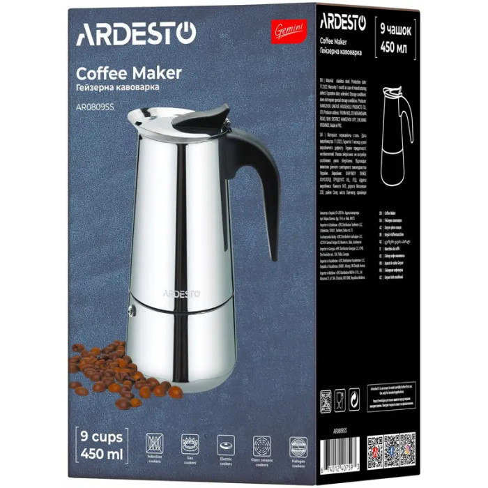 Гейзерная кофеварка Ardesto Gemini Apulia, 0.45л, 9 чашек, нержавеющая сталь