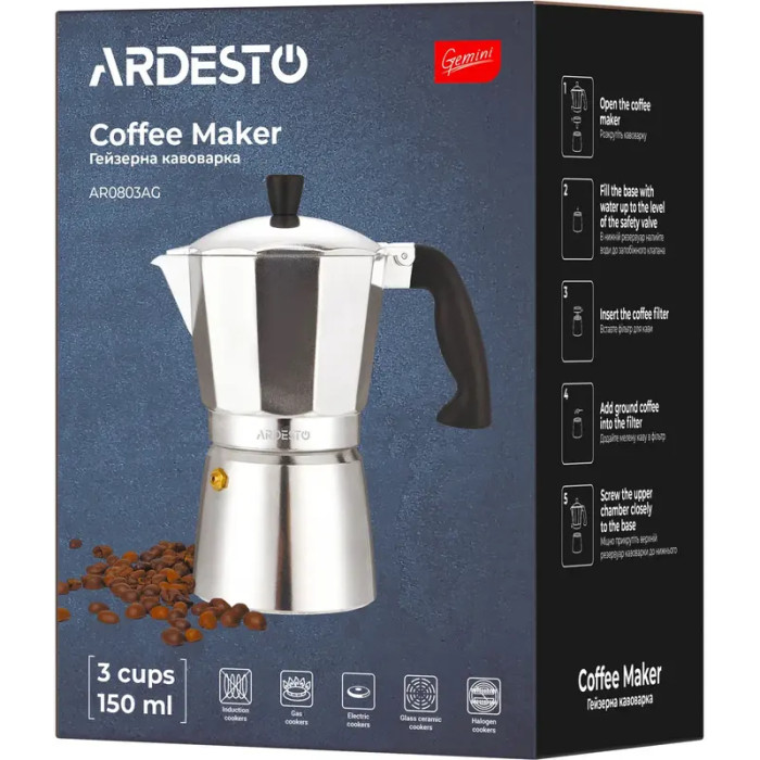 Гейзерная кофеварка Ardesto Gemini Cremona, 0.15л, 3 чашки, алюминий