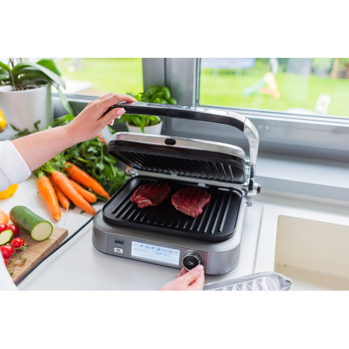 У SteakMaster 7 автоматических программ приготовления. Готовите рыбу или мясо? Просто установите программу по типу продукту. Устройство автоматически начнет нагрев до предустановленной температуры, определит толщину продукта и выберет время его приготовления.