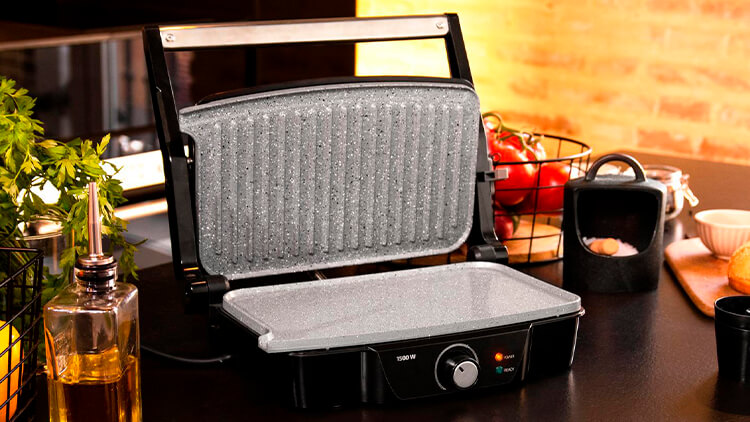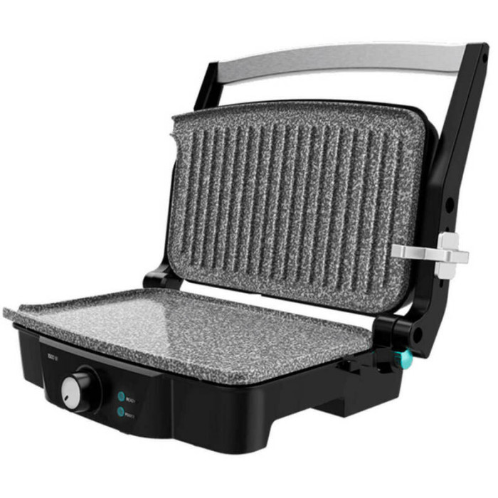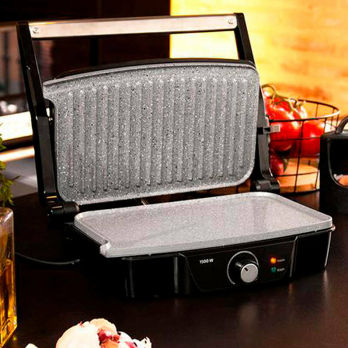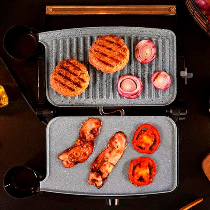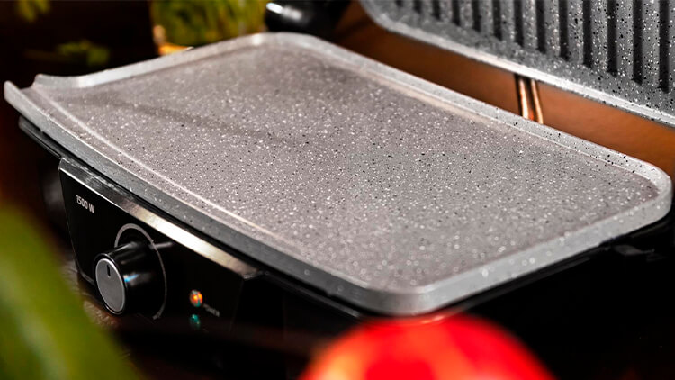 Рабочая панель CECOTEC Rock’nGrill 1500 Stone Ceramic Mix&Grill — не просто практичная, но и эффектная. Вкрапления минералов в составе покрытия создают приятный естественный рисунок, как у натурального камня. Готовить на таком — одно удовольствие. А корпус из пластика и металла выгодно подчеркивает этот эффект. Элементы управления расположились на нижней части устройства: удобный поворотный переключатель, а также индикаторы работы и нагрева с подсветкой.