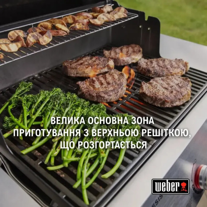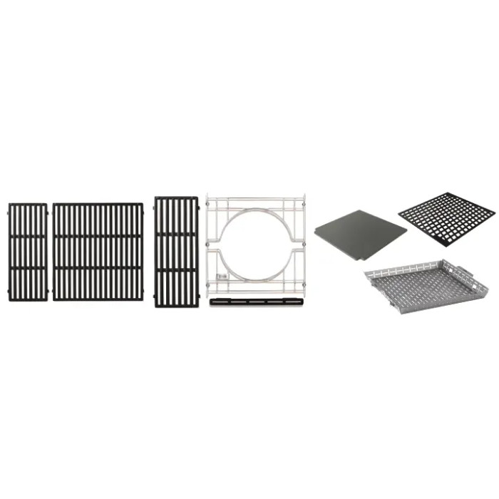 Крючки для принадлежностей: 6; Поворотные фиксирующие колеса: 2; Пластины Flavorizer из нержавеющей стали; Дополнительная верхняя решетка; Кулинарные решетки Weber Crafted (посуда для гриля и рамка продаются отдельно); Чугунная решетка с фарфоровым покрытием; Поддон для сбора жира; Редуктор