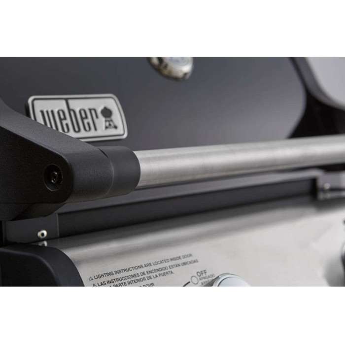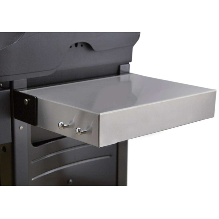 Батончики ароматизатора из нержавеющей стали; Электронная кроссоверная система зажигания; Крышка с фарфоровой эмалью; 2 боковых столика из нержавеющей стали; Прочные, легко очищаемые решетки для гриля от Gourmet BBQ System (GBS) из эмалированного чугуна; Поддон для жира с легким доступом спереди; Встроенная подставка для подогрева; Встроенный в крышку термометр