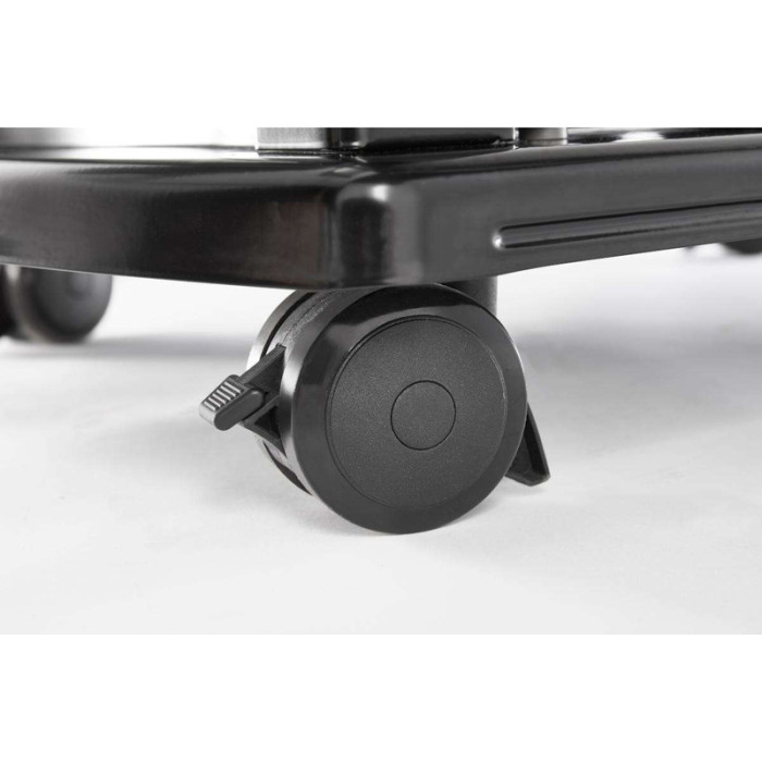 Шкаф гриля закрытой конструкции с окрашенной стальной дверцей; 2 хромированных крючка для инструментов; 4 поворотных колеса, 2 которых с блокировкой; Поддон для жира, доступный спереди; Два складных боковых столика из нержавеющей стали