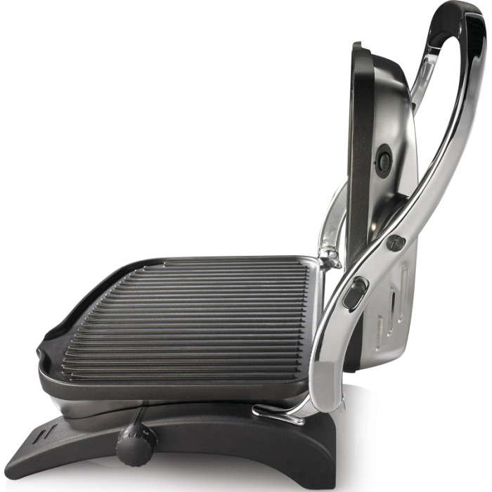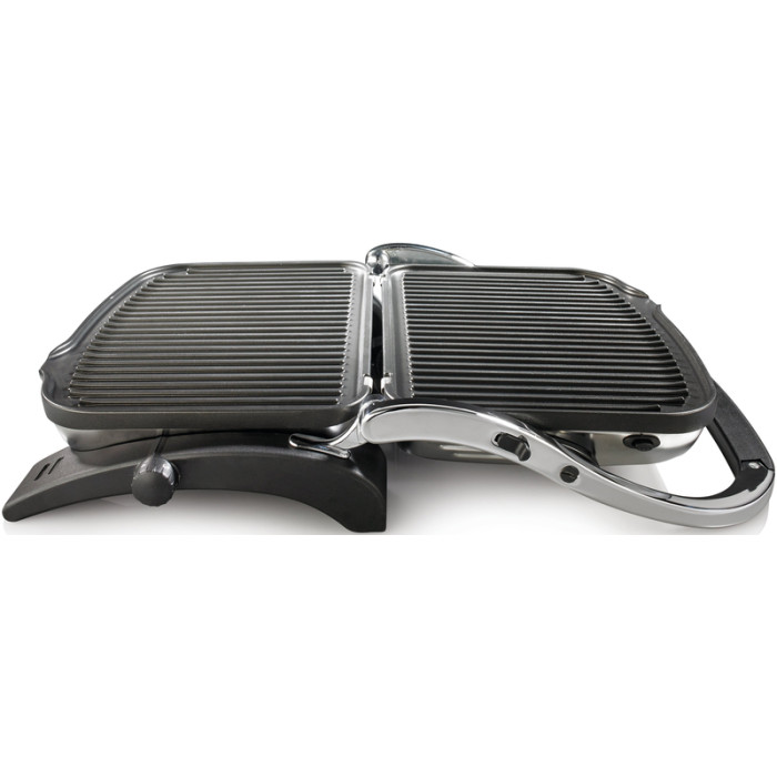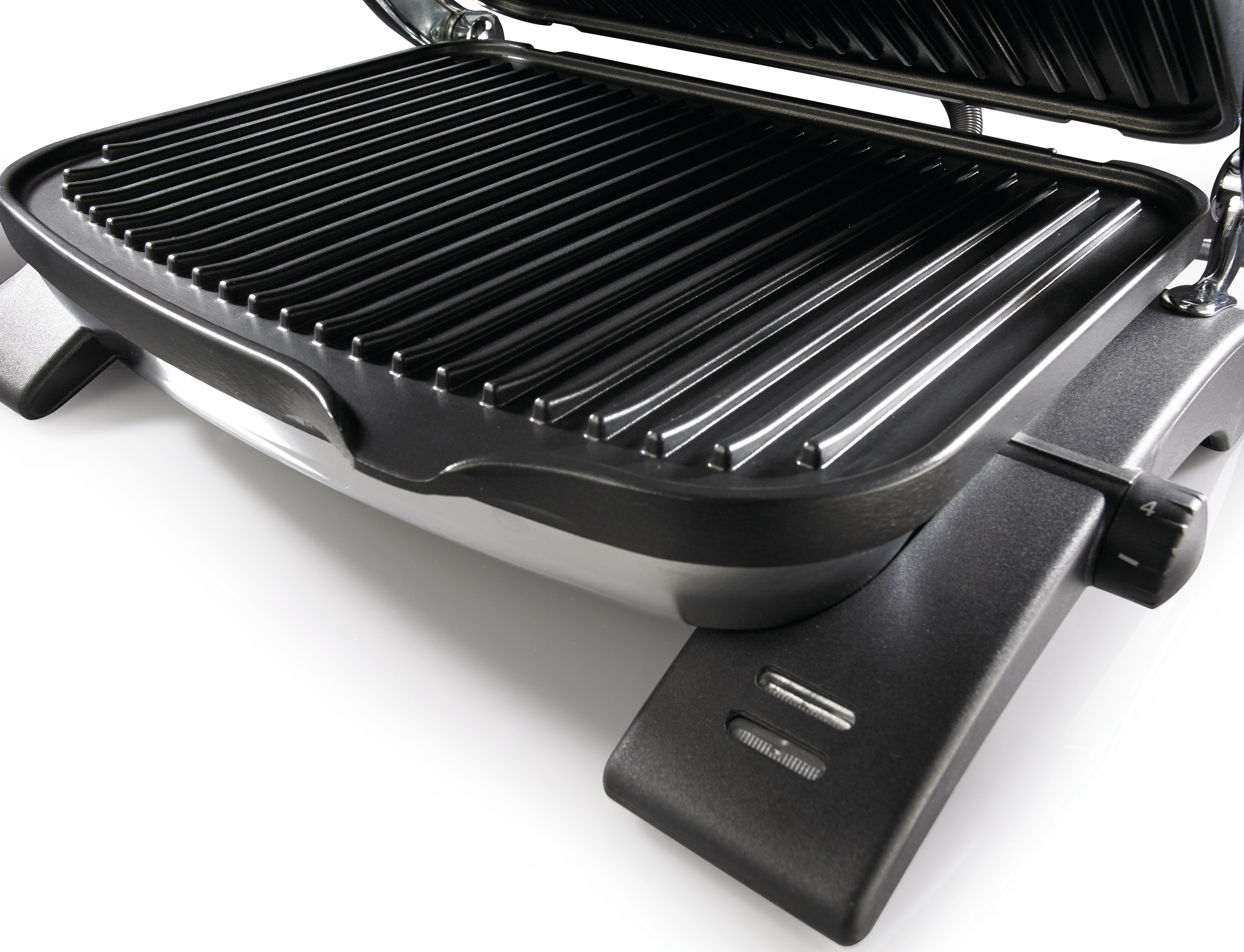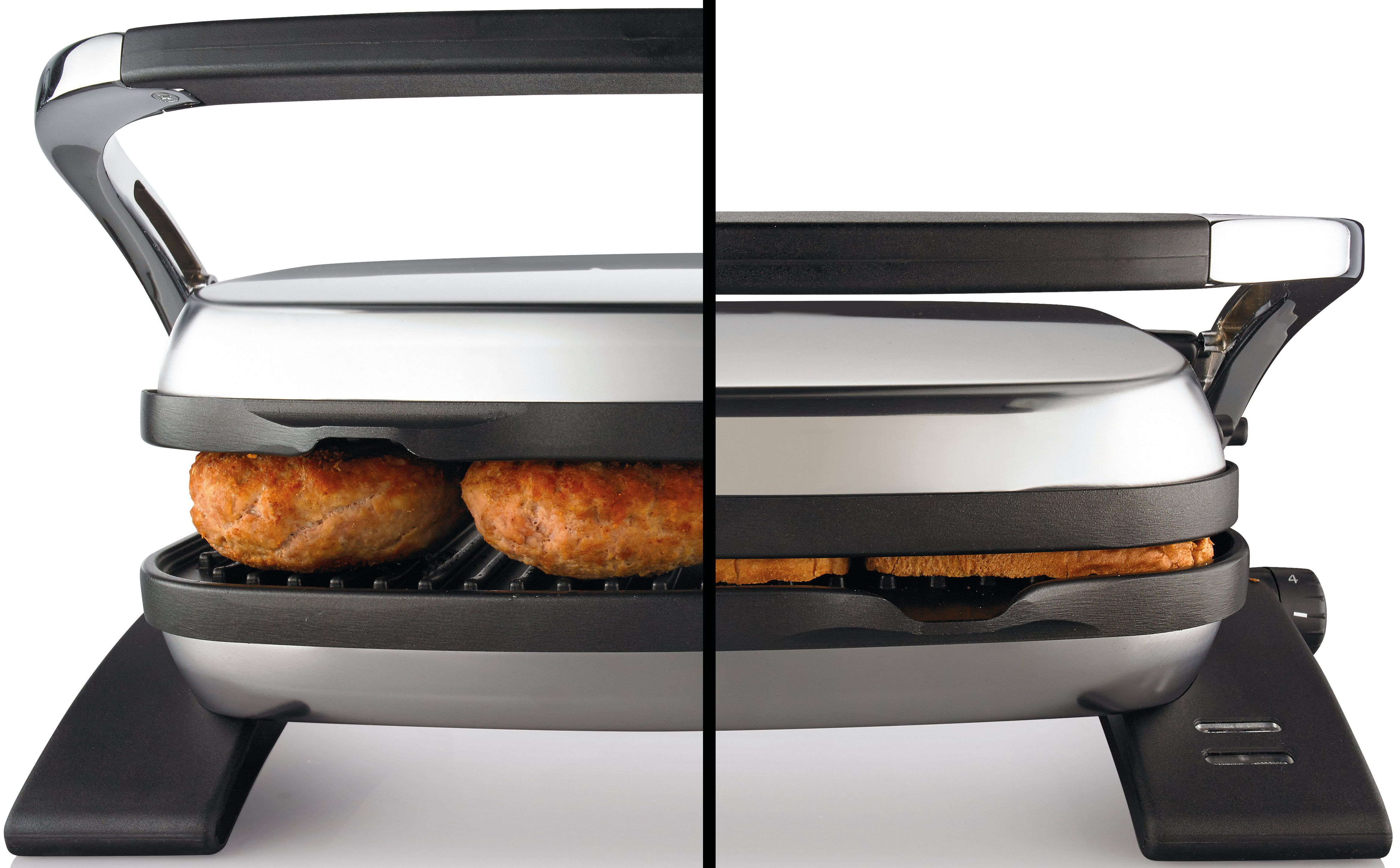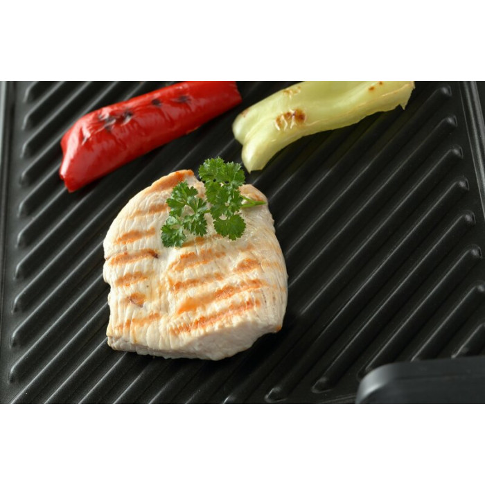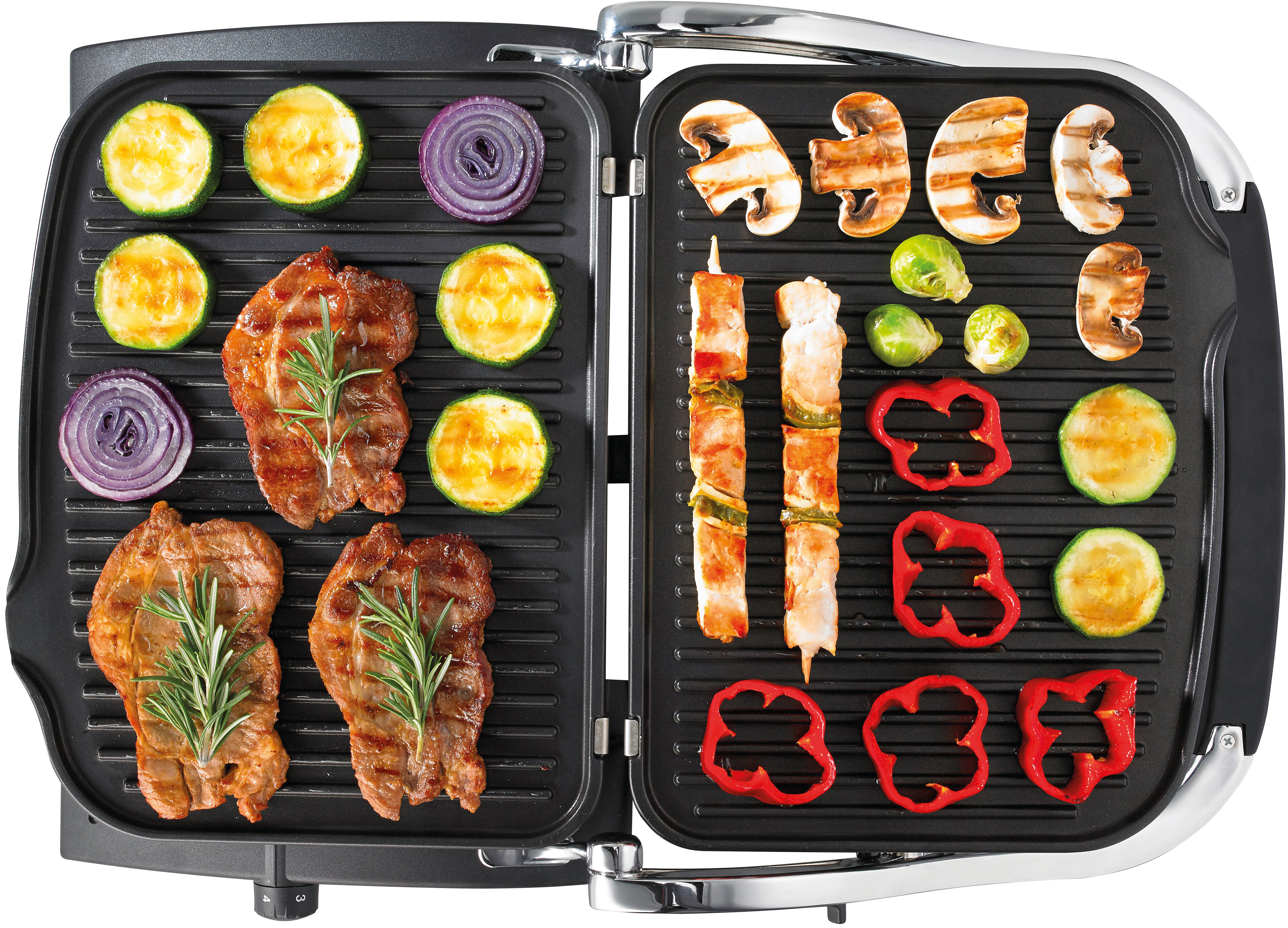 Быстрое приготовление, мощный и равномерный нагрев, контакт с нижней и верхней пластинами делают это устройство идеальным для любителей гриля. Регулировка высоты верхней пластины и ее фиксация в заданном положении очень удобна при запекании открытых бутербродов и блюд под сыром. Гриль можно также полностью разложить, как книжку, и получить дополнительную поверхность для жарки.