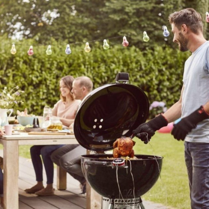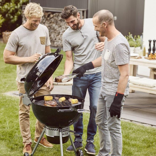 Weber Master-Touch Premium — это стильный, а также фантастически практичный угольный гриль. Его чаша и крышка изготовлены из стали и покрыты фарфоровой эмалью, что защищает их от коррозии и гарантирует, что устройство прослужит вам долгие годы. Более того, гриль установлен на двух прочных, резиновых, всепогодных колесах, что позволяет легко и безопасно перемещать его по террасе или саду. С таким помощником ни один пикник на заднем дворе уже не будет прежним.