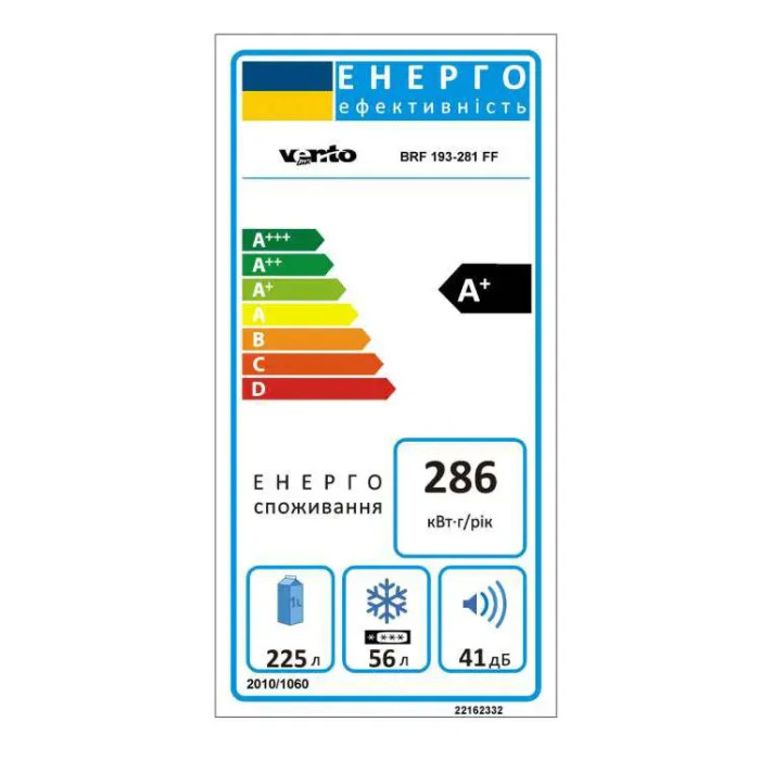 - Полезный объем холодильника и морозильной камеры – 225/56 л.