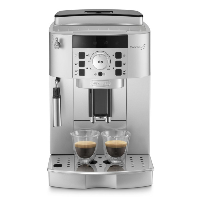 Кофемашина DeLonghi ECAM 22.110 SB Magnifica S оборудована новой кнопочной панелью управления. Вращением регулятора вы можете изменить крепость кофе. А нажатие кнопки позволяет выбрать порцию необходимого объема. Температуру воды или жесткость по своему предпочтению можно запрограммировать в этой модели кофемашины. Мощность прибора 1450 Вт. Давление, которое создается в системе, составляет 15 бар, это идеальное значение для качественной экстракции кофейного порошка.
