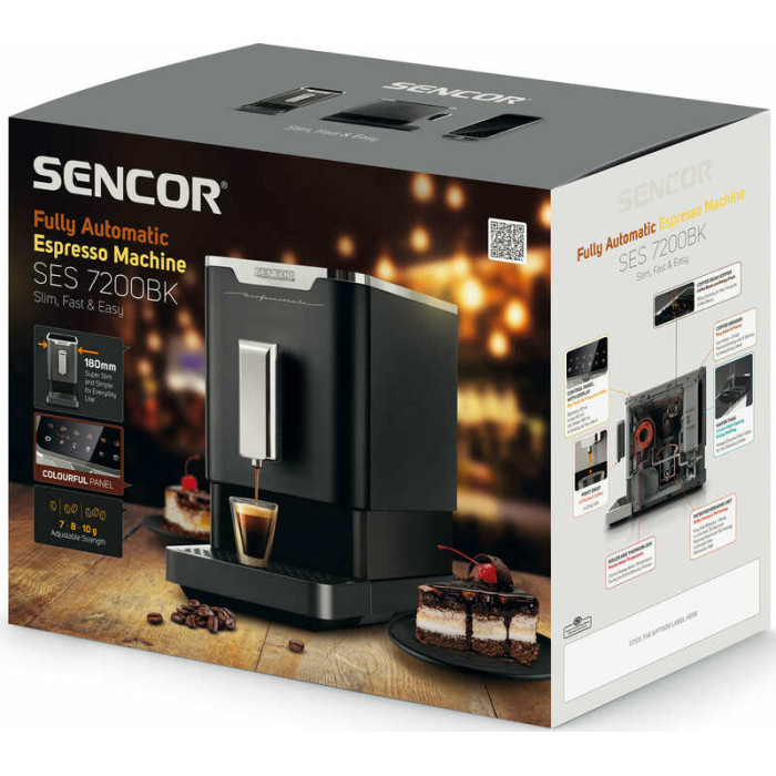Автоматическая кофемашина Sencor SES 7200BK – настоящая находка для всех, кто не представляет себе свой день без чашечки-другой свежезаваренного кофе. Она быстро и легко готовит кофе нужной крепости благодаря регулируемому помолу и имеет систему предварительной заварки, помогающую еще больше раскрыть все нюансы вкуса выбранных вами кофейных зерен. Простая и понятная панель управления сверху позволяет в пару касаний настроить все необходимое, а функция запоминания размера чашки еще больше упростит вам задачу.