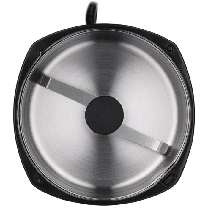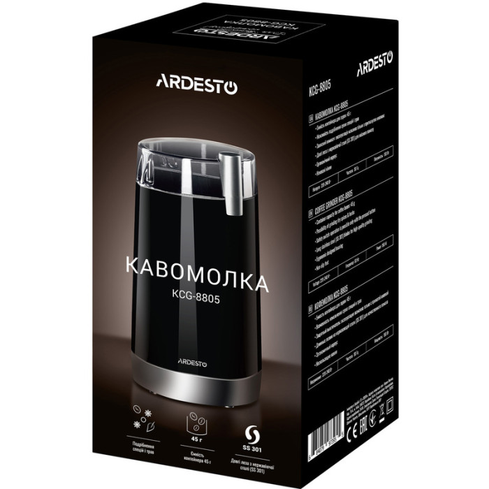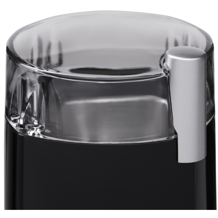 Качественный помол обеспечивает острые лезвия из нержавеющей стали. Кофемолку также можно использовать для измельчения орехов, специй и сыпучих продуктов. Безопасная работа реализована за счет продуманной конструкции — запуск кофемолки происходит только с закрытой крышкой. Корпус кофемолки выполнен из прочного черного глянцевого пластика и вставок серебристого цвета. Прозрачная крышка позволяет контролировать процесс работы, а внутренний стальной контейнер на 45 г – простой доступ к измельченным продуктам и легкую очистку.