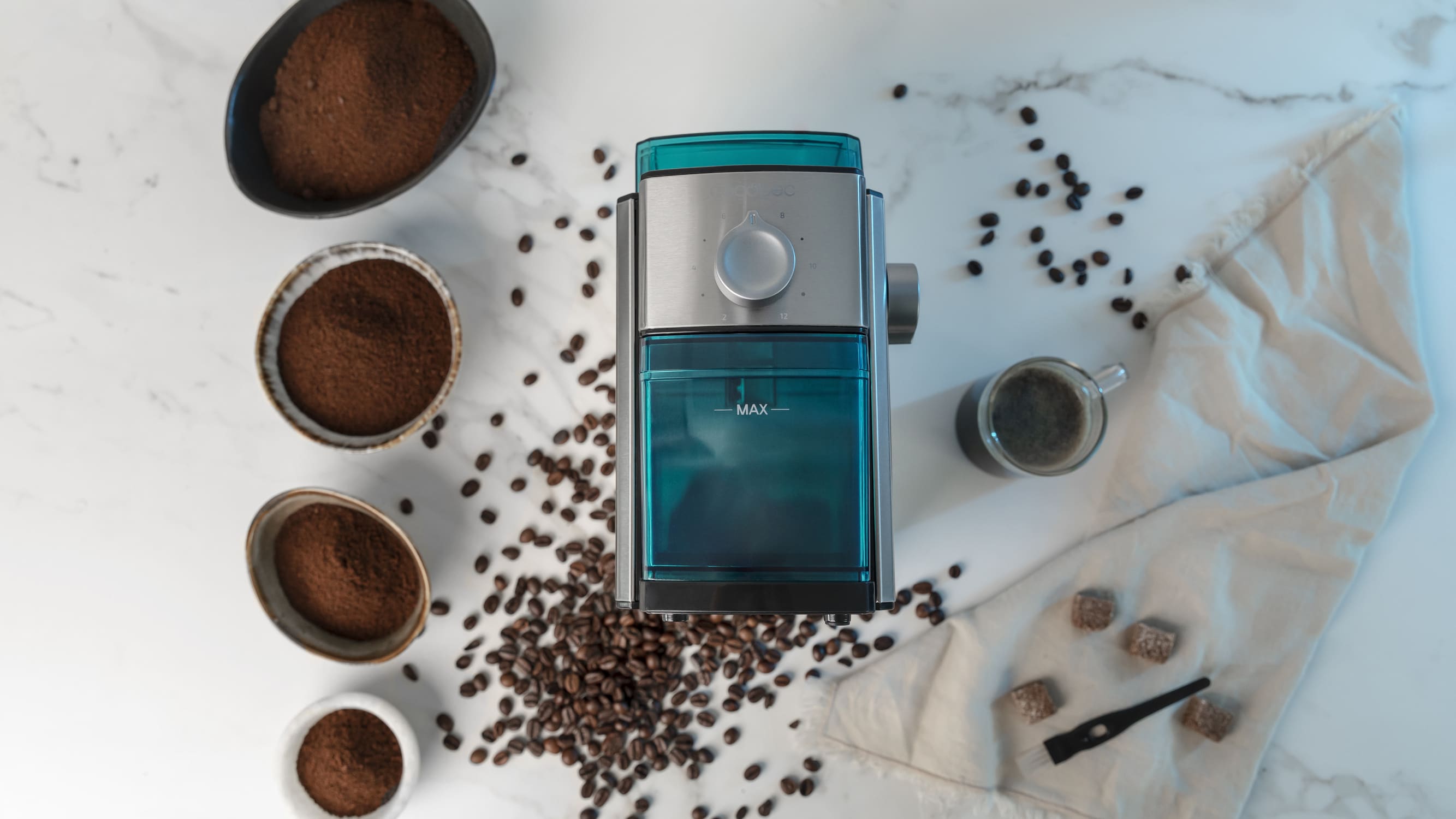 Не представляете утро без свежего и ароматного кофе? Напиток из свежемолотых зерен имеет более выраженный запах и вкус. Кофемолка CECOTEC SteelMill 2000 Adjust – одна из лучших домашних кофемолок, так как выполнена из нержавеющей стали, имеет мощность 150 Вт, 17 степеней помола и вместимость на 12 чашек. Она дает более равномерный помол, что сказывается на вкусе и консистенции приготовленного напитка.