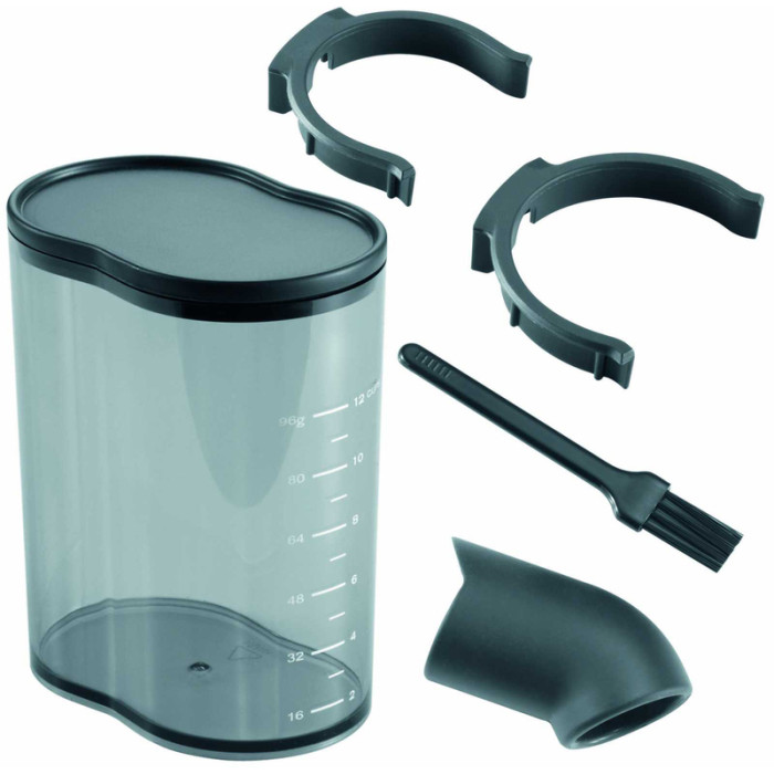В комплекте с устройством идет емкость для сбора свежемолотого кофе, которая вмещает около 250 г кофе. Поэтому вы можете намолоть себе кофе на одну порцию или на большую компанию сразу, как захотите. Или можете сделать себе запас – емкость идет с крышкой, что позволяет без проблем хранить молотый кофе под рукой.