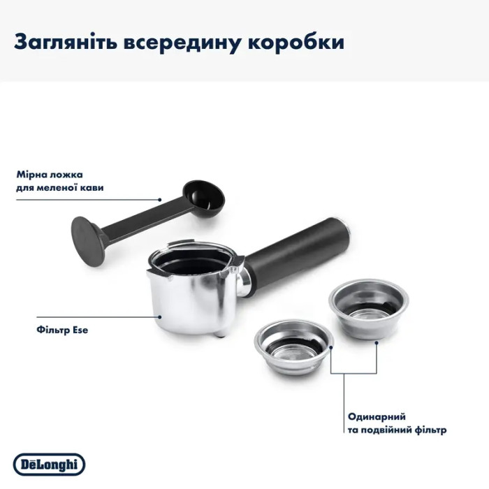 Робота машини надзвичайно проста. Поверніть ручку або натисніть кнопку та насолоджуйтеся улюбленим кавовим напоєм. У комплекті ви отримаєте фільтри для приготування однієї або двох чашок кави. Виберіть правильний фільтр і приготуйте навіть дві чашки еспресо одночасно, не втративши в якості та смаку. Фільтри De'Longhi мають подвійне дно, що гарантує відмінний аромат і насичену золотисто-горіхову крема пінку. Фільтр підходить також для саше ESE. Тиск 15 бар забезпечує оптимальну екстракцію кави.