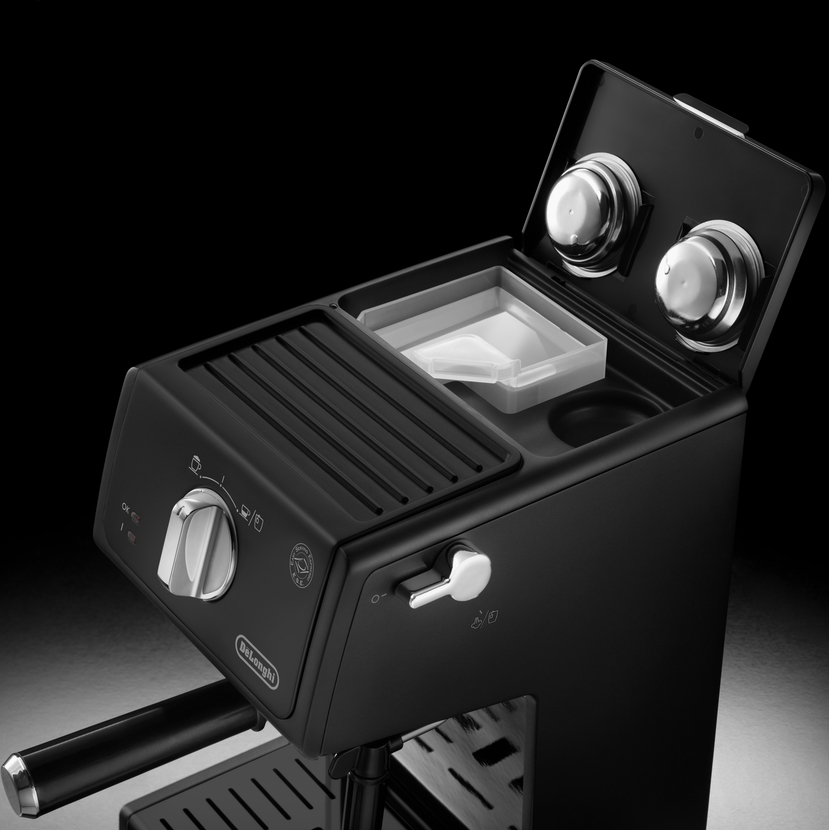 Кофеварка DeLonghi ECP 31.21 BK – стильное и простое в использовании устройство. Красивый пластиковый корпус, приятная форма – такая кофеварка украсит любую кухню. Давление помпы в ней составляет 15 бар, благодаря чему вы получите отличный эспрессо. С ней вы без проблем приготовите любой кофейный напиток. Кофеварка имеет профессиональный холдер фильтров и фильтры для приготовления 1, 2 чашек, а также фильтр, который понравится любителям использовать чалды.