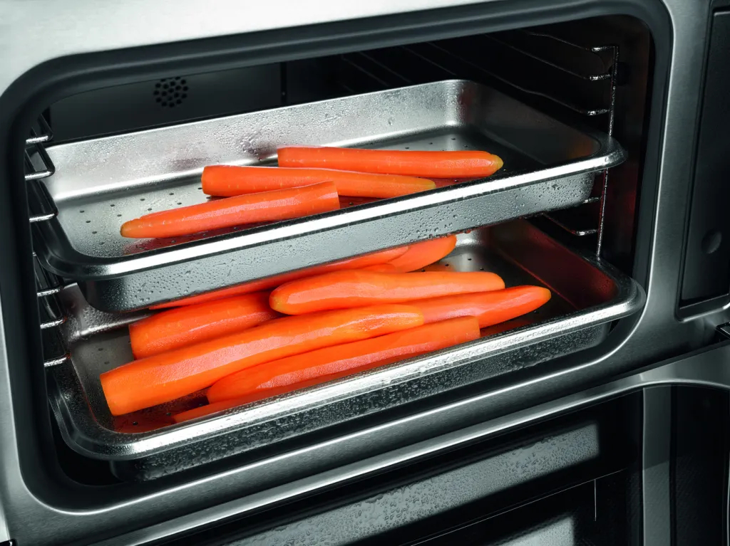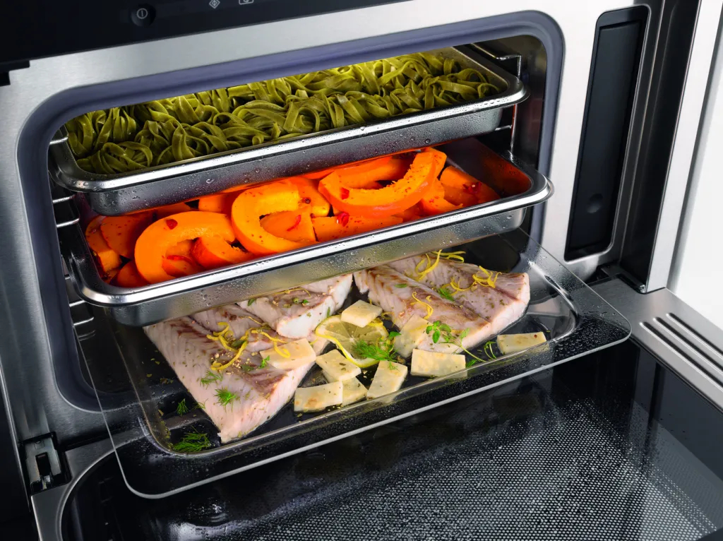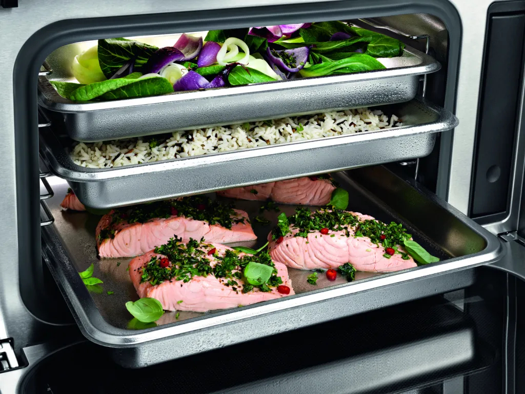 Новая рабочая камера пароварки Miele с функцией DualSteam позволяет готовить в больших количествах и подавать блюда к столу именно тогда, когда они идеально приготовились Благодаря рабочей камере объёмом 40 литров вы можете размещать один большой или два маленьких контейнера на каждом из трёх уровней. Таким образом вы можете легко приготовить обед для большой компании.