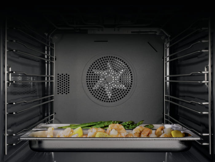 Дверь духовки оснащена сложным амортизирующим механизмом для исключительно плавного открывания и закрывания. При этом она легко открывается на 90° — для удобного беспрепятственного доступа к продуктам в рабочей камере.