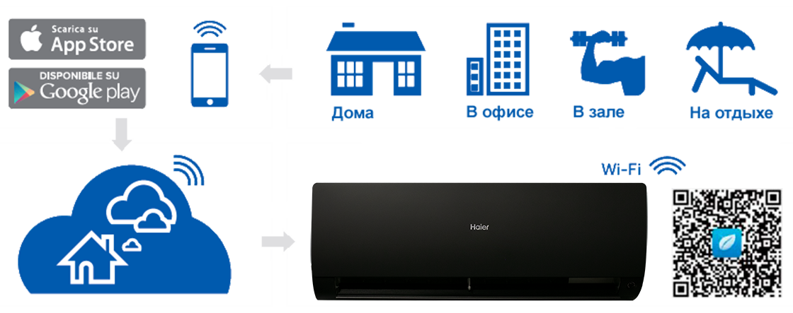 Кондиционер может комплектоваться Wi-Fi модулем (дополнительная опция), что обеспечивает гибкость и удобство управления. Загрузите приложение «Haier Smart Air 2» или «hOn» на свой смартфон или планшет (iOS, Android) и сможете настраивать работу кондиционера, включать и выключать его где бы вы ни находились.