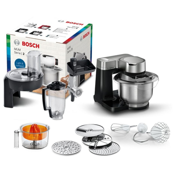 1 x крышка; 1 x прибор для нарезки; 1 x чаша для замешивания из нерж. стали; 1 x мясорубка; 1 x металлический крюк для замешивания теста; 1 x насадка-блендер пластик; 1 x диск-терка; 1 x формовочный диск (грубый); 1 x формовочный диск (средний); 1 x венчик для замешивания; 1 x венчик для сбивания; 1 x двухсторонний диск-терка; 1 x цитрус-пресс