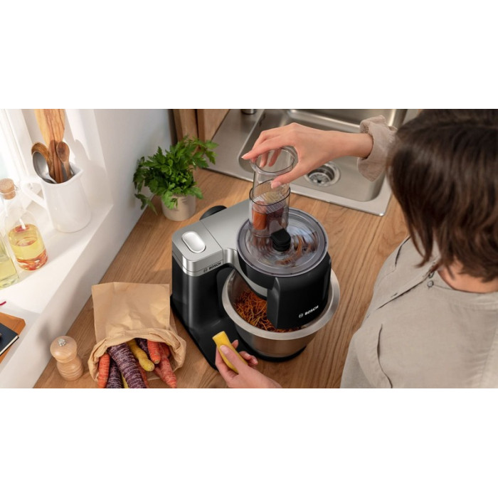 Легкость очистки; Большинство принадлежностей пригодны для мытья в посудомоечной машине; Удобство хранения: отсек для кабеля для легкой и быстрой смотки кабеля; Плавный пуск для предотвращения разбрызгивания и распыления муки; Универсальный рычаг для крепления насадок со специальным передаточным механизмом и 3 позициями приводов для оптимальной передачи мощности; Большая чаша с нержавеющей стали объемом 3,8 л с особой внутренней формой для легкого приготовления теста (до 2,4 кг бисквитного теста или 1,7 кг дрожжевого теста); Резиновые ножки-присоски для большей устойчивости; Высокая безопасность благодаря защите от перегрева
