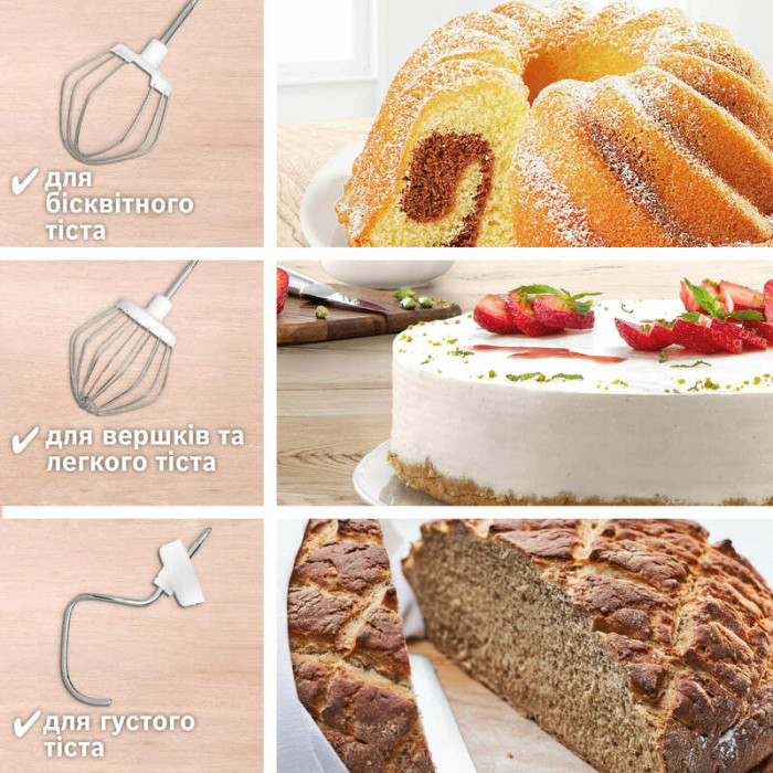- Венчик для взбивания, венчик для перемешивания и крюк для теста