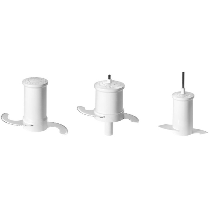 Универсальный нож; Универсальный мини-нож; Насадка для теста; Соковыжималка для цитрусовых; Насадка для нарезки кубиками 8х8 мм; Регулируемый шинковальный диск; Насадка для взбивания; Двусторонний диск-терка; Диск для натирания крошки; Диск для нарезки брусками 8х8 мм; Насадка для нарезки кубиками 12х12 мм; Кейс для хранения насадок