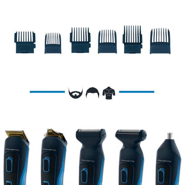 В комплекте триммера Rowenta TN9460F4 есть шесть сменных насадок: мини-бритва для оформления бороды, бритва для тела с насадкой-гребнем, которая не раздражает кожу для комфортного бритья и идеально гладких результатов, лезвие для точной стрижки бороды для уникальной детальной отделки, насадка для удаления нежелательных волос в носу и ушах и специальное лезвие для чистого бритья и детальной проработки стрижки. Также в наборе имеется противоударный чехол, для хранения триммера и аксессуаров в одном месте.